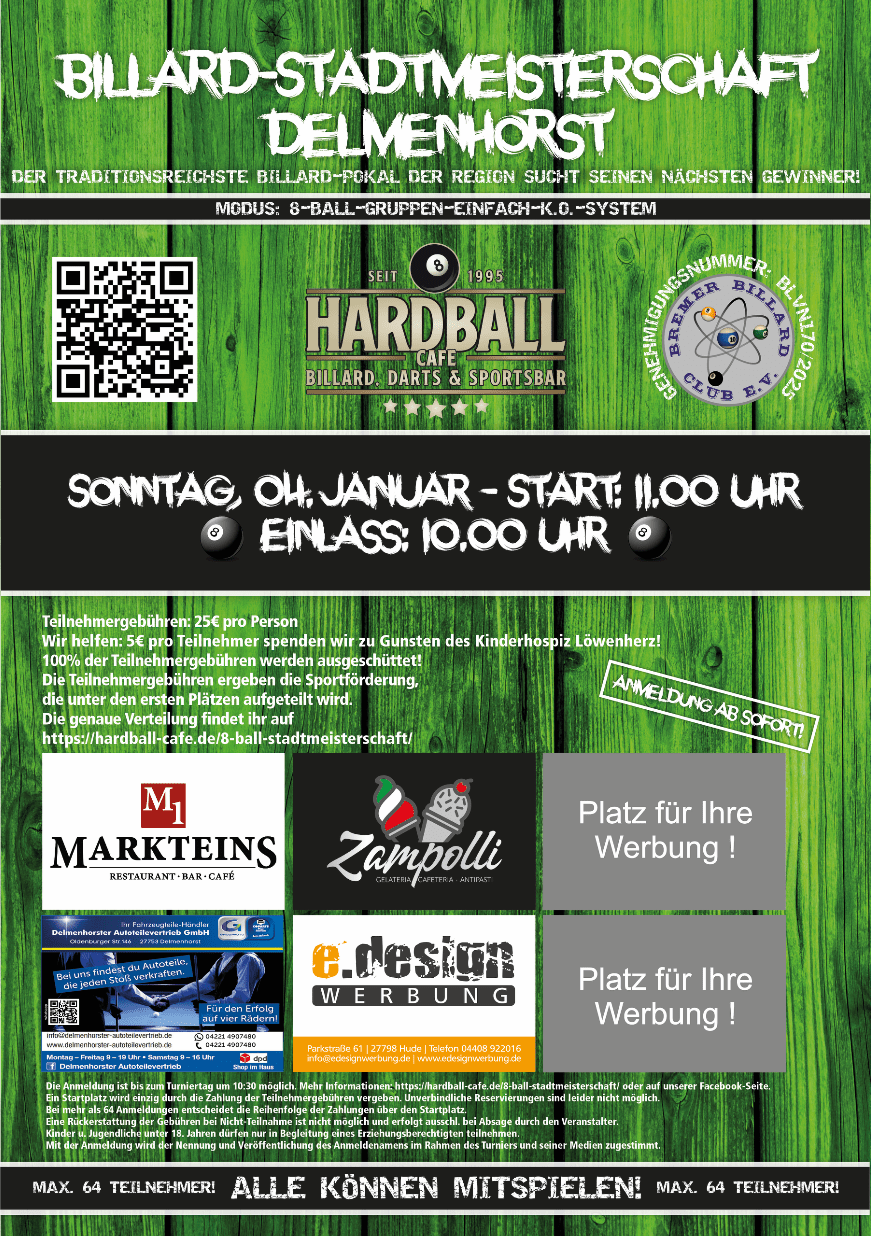 - Persönlich im Hardball-Café in Delmenhorst ab sofort bis 10:30 Uhr am Turniertag – freie Plätze vorausgesetzt!